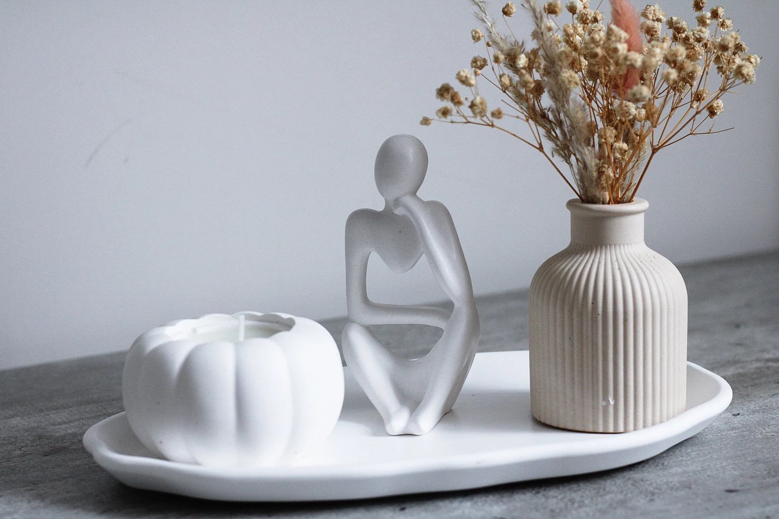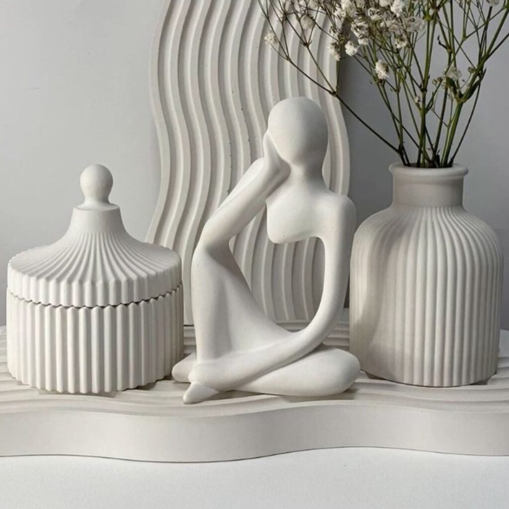 Thinker statues and abstract sculptures made from concrete create a thoughtful and artistic vibe. A set of two or three minimalist statues looks great on bookshelves, office desks, or entrance tables.